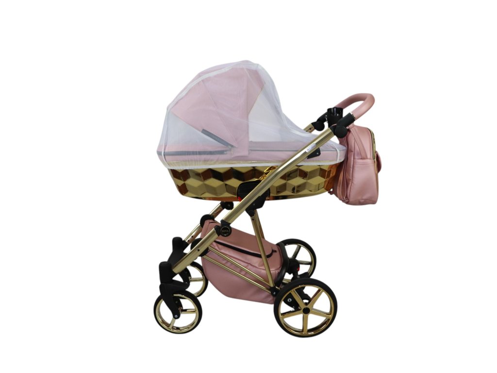 Moskitonetz, Regenschutz, eleganter Rucksack, großer Einkaufskorb, Getränkehalter, Matratze, Belüftungsnetz in der Haube, Adapter für die Babyschale sowie pannensichere Reifen.